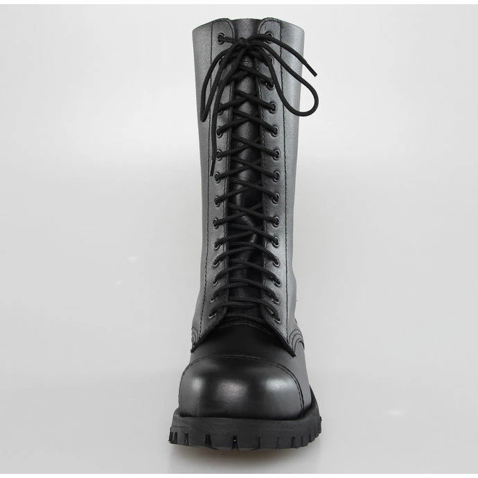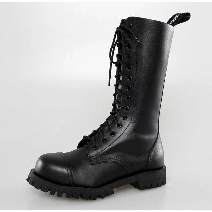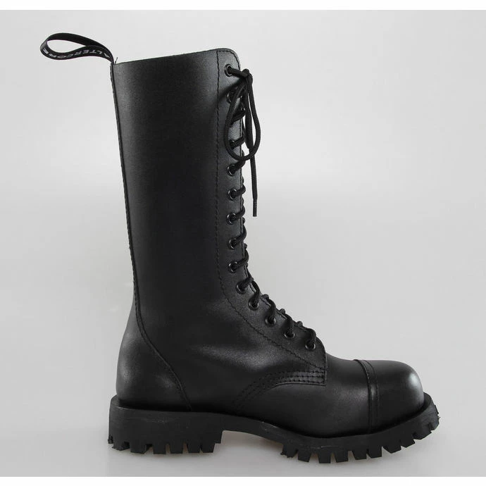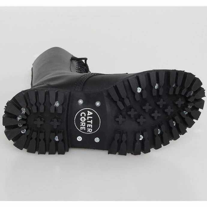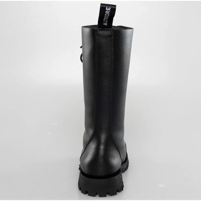 14-hole boots by ALTERCORE made of genuine leather coated in black.